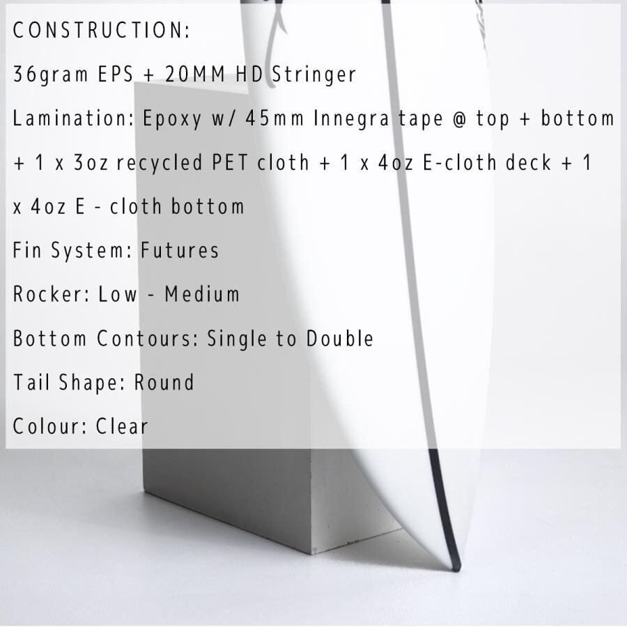 ラミネーション: エポキシ+45mmインネグラ・テープ(トップ+ボトム + 1 x 3oz リサイクルPETクロス + 1 x 4oz Eクロスデッキ + 1 x 4oz Eクロスボトム