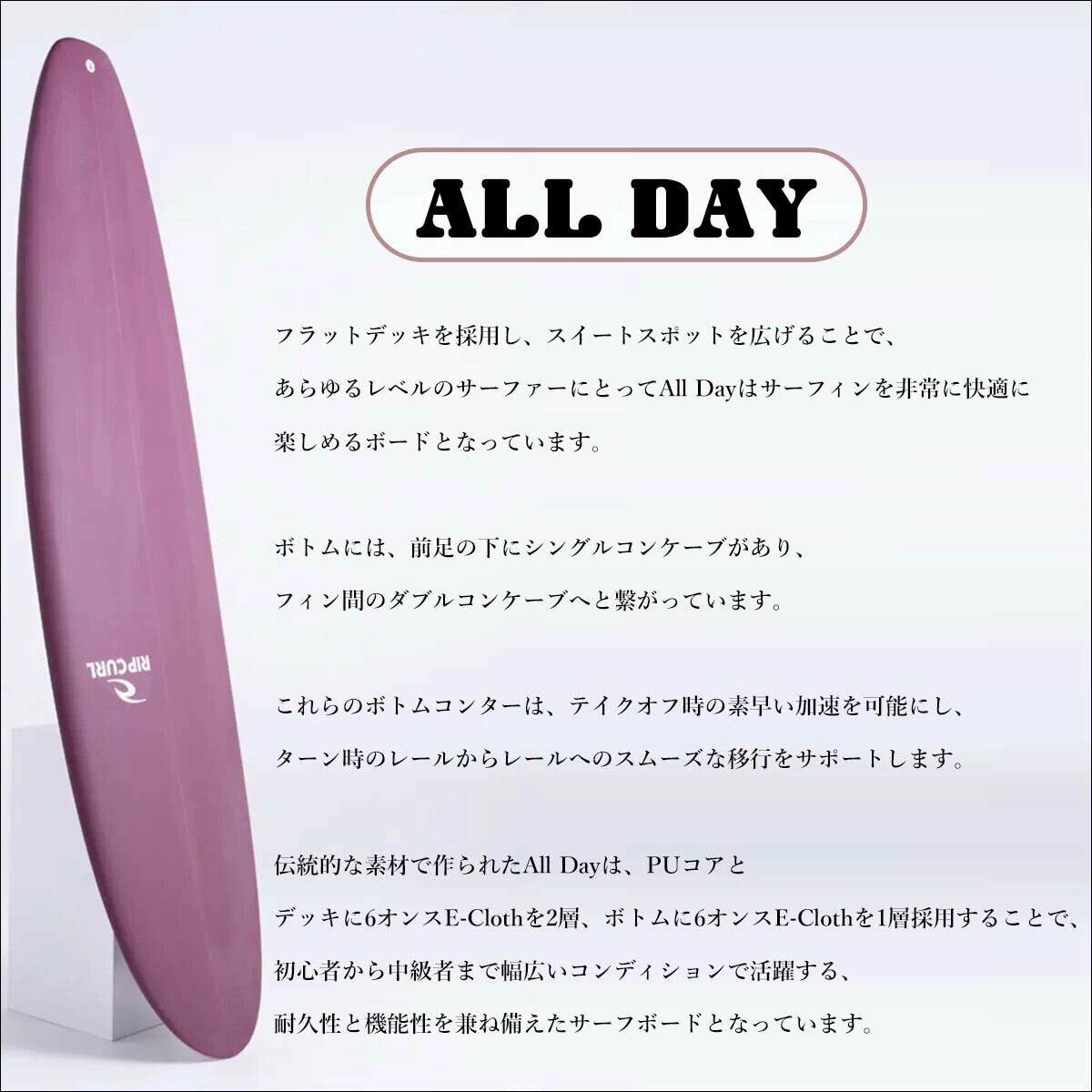 フラットデッキを採用し、スイートスポットを広げることで、あらゆるレベルのサーファーにとってAll Dayはサーフィンを非常に快適に楽しめるボードとなっています。