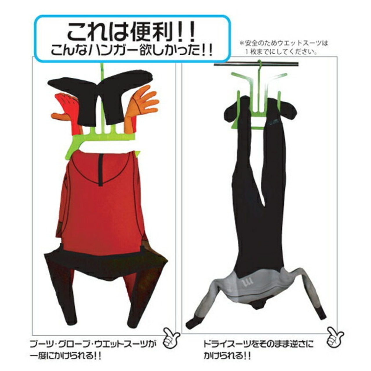 ■ブーツ・グローブ・ウェットスーツが一度にかけられる。